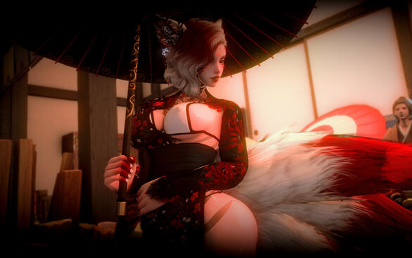 An 18+ cabaret with a harmonious union of cat and kitsune. Stage dancers, intimate sultry atmosphere.